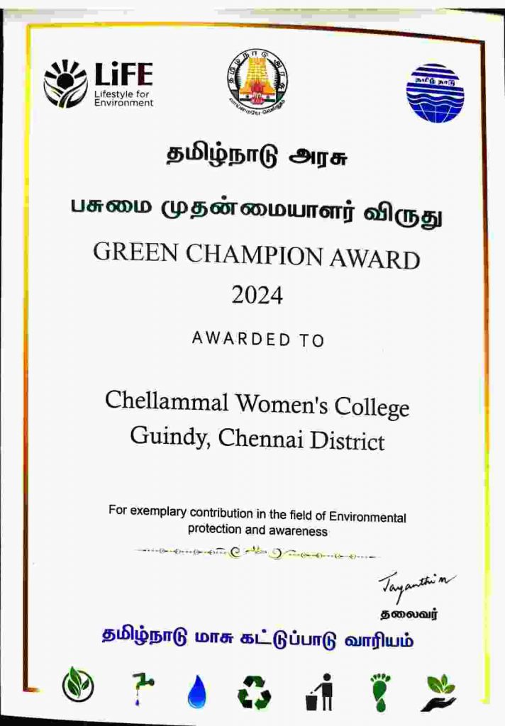 Chellammal Women’s College has been honoured with the Tamil Nadu Green Champion Award, carrying a cash prize of Rs.1,00,000 (Rupees One Lakh). The College fulfilled 11 of the 13 prescribed evaluation criteria, supported by the documented evidences. The award was received by the Principal Prof. Dr. V. Malarvizhi along with the Coordinator Dr. S. Susa, and the Eco Club Committee members which was presented by the Chennai District Collector on 15th August 2025 at the Chennai Collectorate Office, during the 79th Independence Day celebrations, in recognition of the Institution’s consistent sustainable development practices and meaningful community engagement.