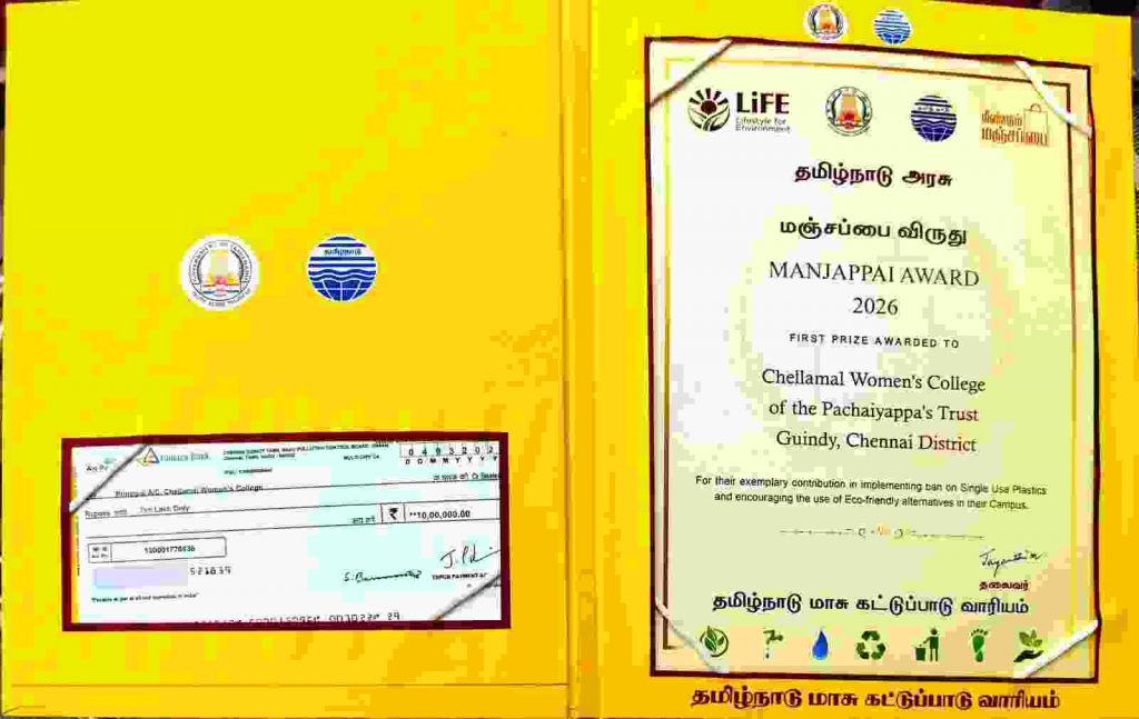 The award was presented by Hon’ble Minister Thiru. Thangam Thenarasu, Minister of Finance and Environment, Government of Tamil Nadu, Government of Tamil Nadu, Tmt. Supriya Sahu, I.A.S., Additional Chief Secretary to Government Environment, Climate Change and Forests Department, Government of Tamil Nadu and Dr. M. Jayanthi, I.F.S., Chairperson, Tamil Nadu Pollution Control Board at the Manjappai Award Ceremony 2026 held on 6th March 2026 at the Tamil Nadu Secretariat. Prof. Dr. V. Malarvizhi, Principal of Chellammal Women’s College, and Dr. G. Vimala, Eco Club Coordinator, received the award on behalf of the institution for their exemplary contribution in implementing ban on single use plastics and encouraging the use of eco-friendly alternatives in the campus. The achievement reflects the dedicated efforts of the Eco Club and Swachhata Action Plan (SAP) committee, led by Dr. V. Malarvizhi as Chairperson and coordinated by Dr. G. Vimala