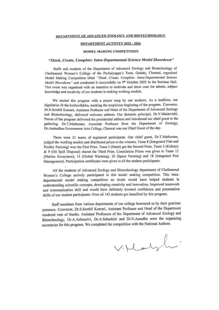 Staffs and students of the Department of Advanced Zoology and Biotechnology of Chellammal Women’s College of the Pachaiyappa’s Trust, Guindy, Chennai, organized Department Association Program 2024-2025 titled, “ENTOMOL 2024” and conducted it successfully on 20th September 2024 in the Seminar Hall.