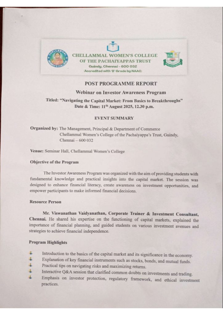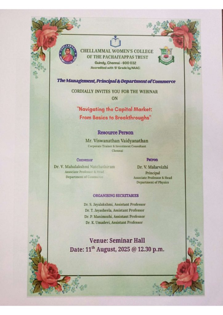 - Convenor Dr.S. Jayalakshmi, (Head of the department of PG and Research Department of Commerce – Shift I ) & organised by Department of Commerce (PG) Shift II, Department of Corporate Secretaryship Shift II, Department of B.Com (Accounting and Finance) – Shift II, Department of Commerce – Shift II and Department of Business Administration – Shift II.