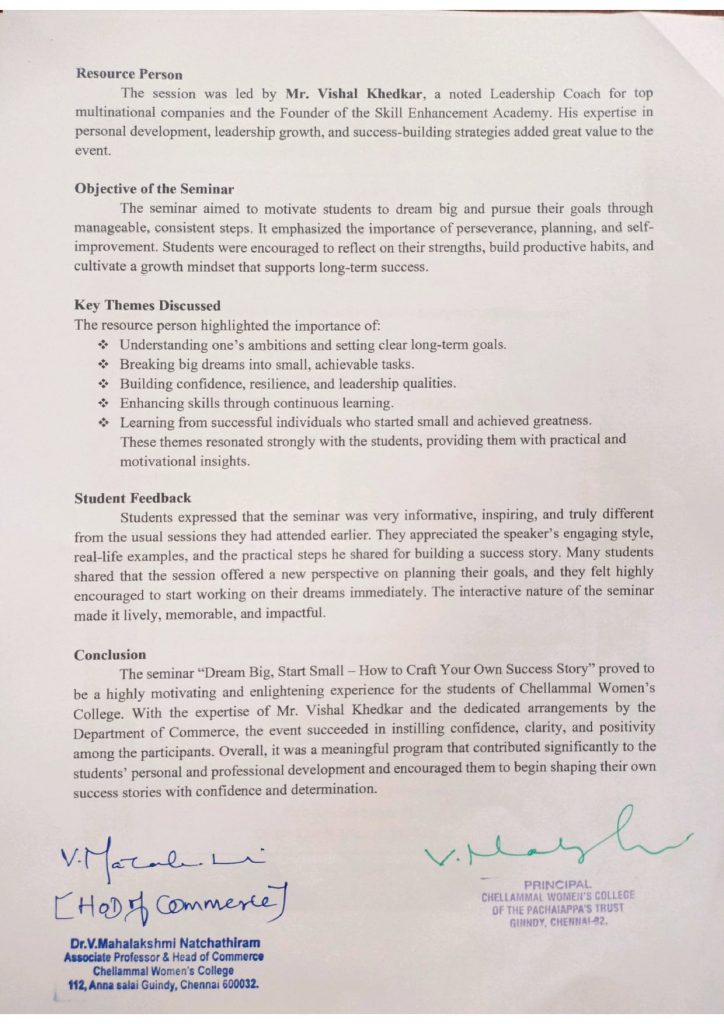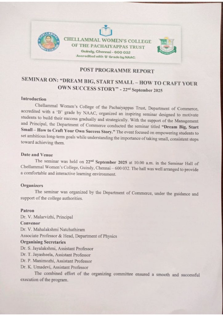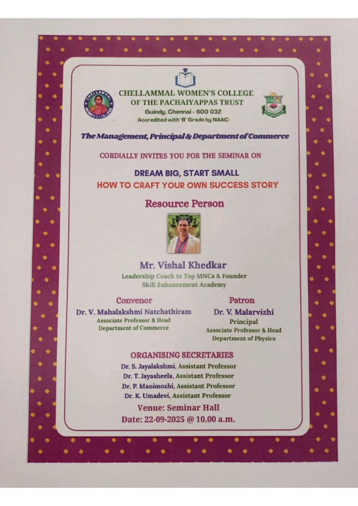 - A Seminar on “Self-Motivation & Self Efficacy and Building a path to Success” by Dr. K. Vasuki, Associate Professor & Head of the Department of Commerce, Sir Theagaraya College, Chennai 600 021., conducted on 07.2023 from 10.00 a.m. to 1.00 p.m. at Seminar Hall, Chellammal Women’s College.