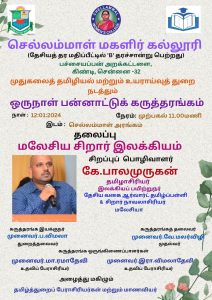 சென்னை கிண்டியில் உள்ள செல்லம்மாள் மகளிர் கல்லூரியின் முதுகலைத் தமிழியல் மற்றும் உயராய்வுத்துறை சார்பாக மலேசிய சிறார் இலக்கியம் என்னும் தலைப்பில் ஒரு நாள் பன்னாட்டுக் கருத்தரங்கம் 12.01.24 வெள்ளிக்கிழமை அன்று நடைபெற்றது. மலேசியா சிறார் இலக்கிய எழுத்தாளர் பாலமுருகன் கேசவன் கலந்து கொண்டு சிறார் இலக்கியத்தின் சிறப்புகள், உத்திகள் மற்றும் சிறார் இலக்கியம் படைக்க வேண்டிய அவசியம் குறித்தும் சிறப்புரையாற்றினார். முதல்வர் முனைவர் வே.மலர்விழி அவர்கள் வாழ்த்துரையும், தமிழ்த் துறைத் தலைவர் முனைவர் ப.விமலா வரவேற்பரையாற்ற விழாவினை தமிழ்த் துறைப் பேராசிரியர்கள் முனைவர் மா.ரமாதேவி முனைவர் இரா.விமலாதேவி இருவரும் ஒருங்கிணைத்தனர். இக்கருத்தரங்கில் இருநூறுக்கும் மேற்பட்ட தமிழ்த்துறை மாணவிகள் கலந்து கொண்டு பயன்பெற்றனர்.