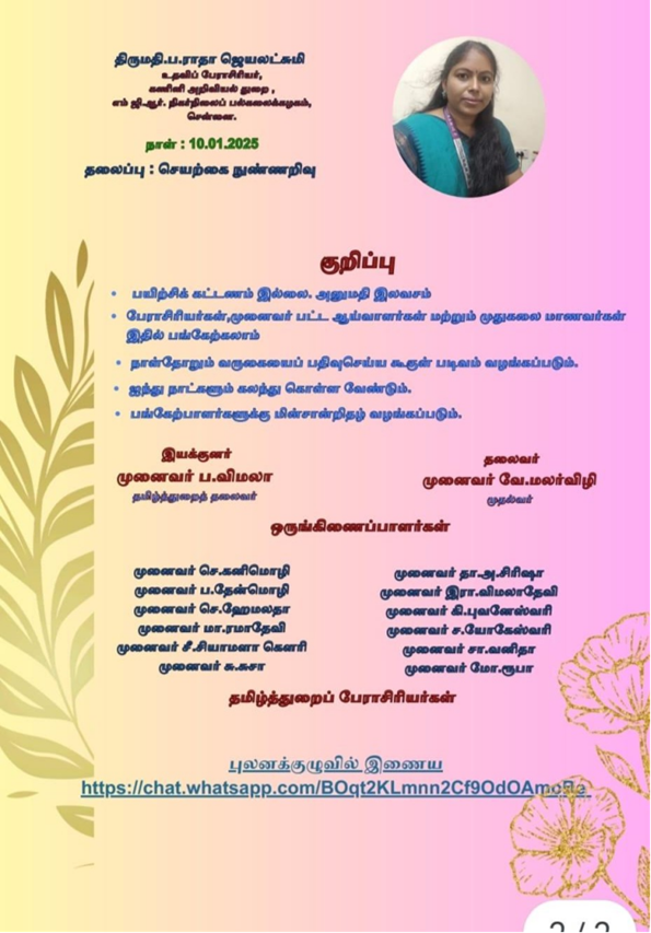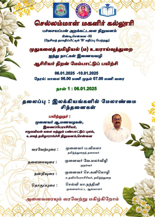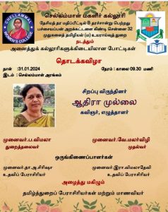்்டலதிடட கழ வகலுமளு. இப்்டலதிடடல கறிலு ஆெி்ிரரகககக நல் ப்ிது் ஏற்டலுல மந்கமக்ட 06.01.2025 மதல 10.01.2025 வுரரி்்த ஐநு ந்டகம செல்லம்ம மகளிர கல்்ி, முகு்ல தமிழிரல மற்ல உரர்யவல ுுற ஆெி்ிரர திறய மமல்்டட ்ரிறெி நடலதிரு. இப் ்ரிறெிரிய மதல ந்ள்த 06.01.2025 அய் இப்ரிறெிரிய சத்டககம்க முகு்ல தமிழிரல மற்ல உரர்யவல