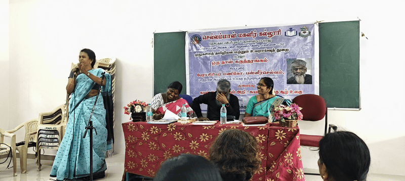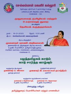 National seminar was held on 19 January 2023. Dr.Vani arivalan, Assistant Professor of Tamil, University of Madras, was given speech about Pazhantamizhlar Kaadum kaadu Saarntha Vazhvum.