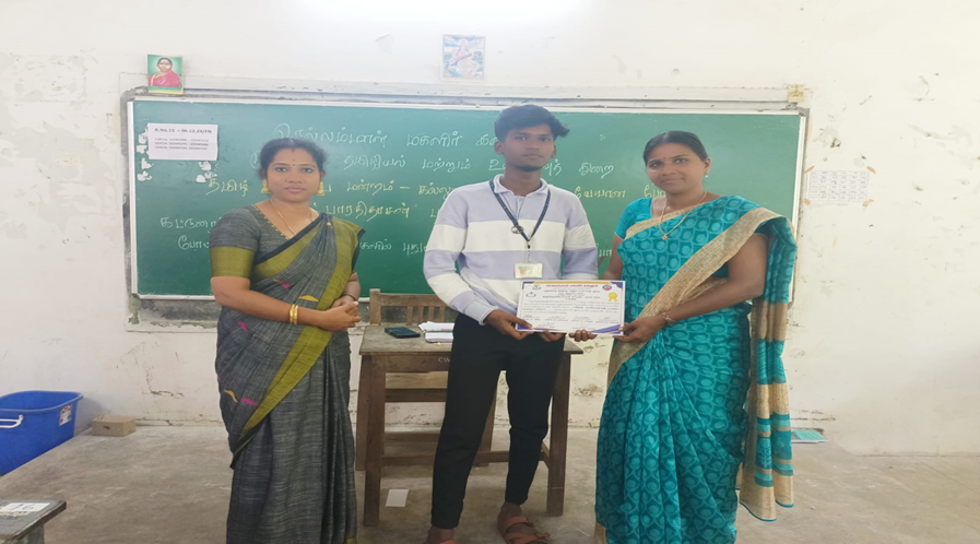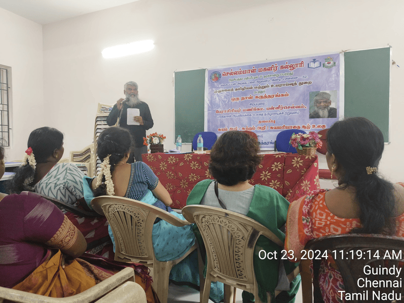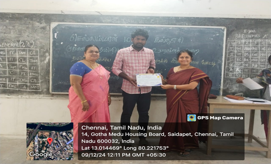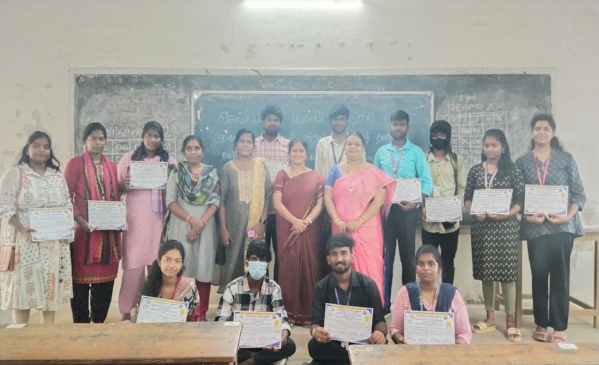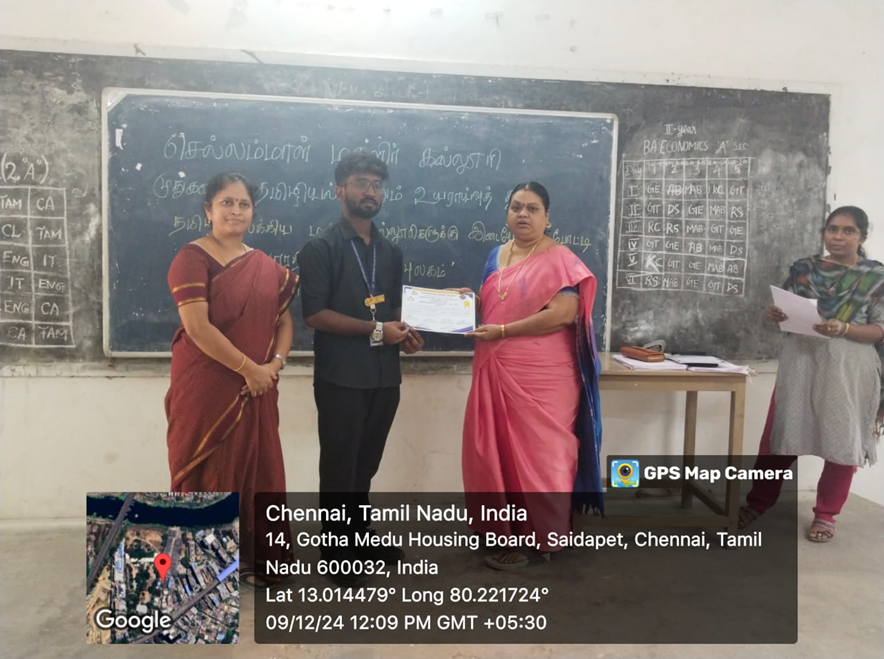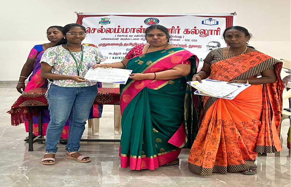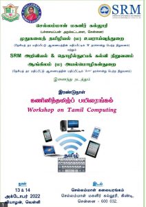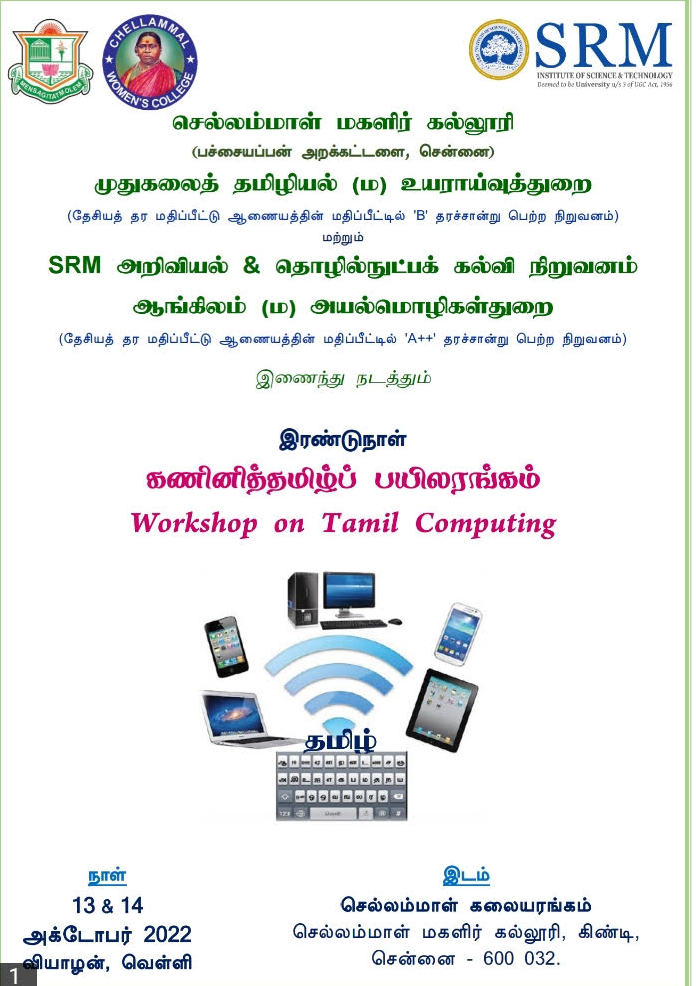 A two-day workshop jointly organized by the Tamil Department of Chellammal Women’s College and SRM Institute of Science & Technology was held on October 13 & 14. On 13.10.2022, the principal of the college attended and inaugurated the workshop by delivering a keynote speech. Associate Professor, SRM Institute of Science & Technology L. Sundaram trained the students effectively on various topics like use of Tamil in electronics, Tamil software classification and development, use of Tamil on the Internet, online learning and teaching of Tamil, use of computers for daily life and research. Prof. Kavita Nair, Head of Department of English and Foreign Languages, Institute of Science & Technology, attended and delivered the keynote address. At the end of the workshop, certificates were awarded to the students who participated in the training.
