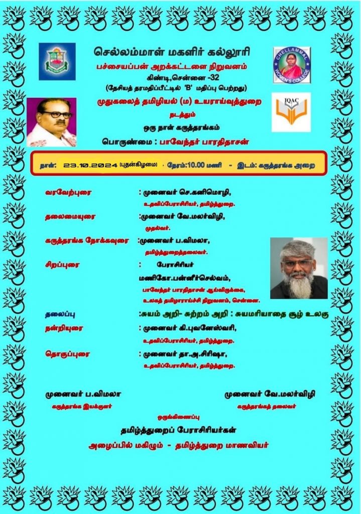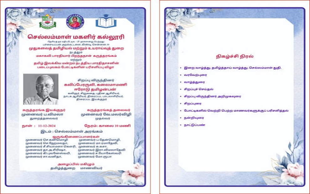 செல்லம்மாள் மகளிர் கல்லூரி, முதுகலைத் தமிழியல் மற்றும் உயராய்வுத் துறையின் சார்பாக, 2024-2025 ஆம் கல்வியாண்டிற்கான நிகழ்வாக, மகாகவி பாரதியார் பிறந்தநாள் ஒருநாள் கருத்தரங்கம் 11.12.2024 அன்று நடைபெற்றது. இக்கருத்தரங்கில் கவிப்பேரருவி கலைமாமணி ஈரோடு தமிழன்பன் கலந்து கொண்டு, பாரதியாரைப் பற்றியும், பாரதிதாசன் உயிருடன் இருந்த காலத்தில், தான் அவருடன் பழகிய அனுபவங்களைப் பகிர்ந்து கொண்டார் அவரது உரை, கருத்தரங்கில் கலந்து கொண்ட மாணவர்கள் ஆசிரியர்களுக்கு புதிய அனுபவமாக இருந்தது.