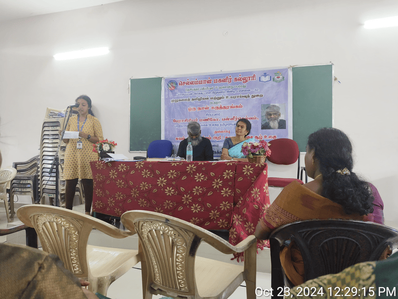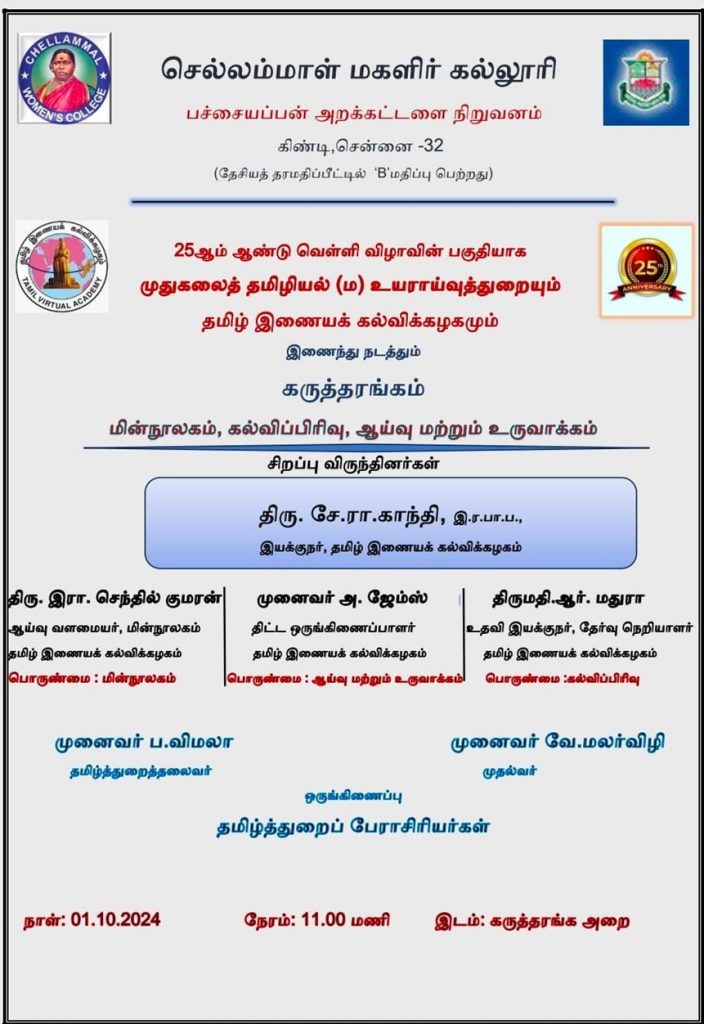 இன்றைய காலகட்டத்தில் ஒரு துறை சார்ந்தவர்களாக இருந்தால் சாதிப்பது என்பது அரிதாகிவிட்டது. முக்கியமாக மொழி சார்ந்து படிக்கக்கூடியவர்கள் தொழில்நுட்பத்தில் கைதேந்தவர்களாக இருக்கும்போது தான் பல்வேறு வகையான வேலை வாய்ப்புகளைத் தக்க வைத்துக் கொள்ள முடிகிறது. எனவே தான் மொழியும் தொழில்நுட்பமும் இன்றியமையாத ஒன்றாக அமைகிறது. இத்தகைய பொருண்மையை மையப்படுத்தி 01.10.2024 அன்று செல்லம்மாள் மகளிர் கல்லூரியில் முதுகலைத் தமிழியல் மற்றும் உயராய்வுத் துறையும் (25 ஆம் ஆண்டு வெள்ளி விழாவின் பகுதியாக) மற்றும் தமிழ் இணையக் கல்வி கழகமும் இணைந்து “மின்நூலகம் கல்விப் பிரிவு, ஆய்வு மற்றும் உருவாக்கம்” என்ற தலைப்பில் கருத்தரங்கத்தை நடத்தியது. இக்கருத்தரங்கின் தொடக்கமாக முதுகலைத் தமிழியல் மற்றும் உயராய்வுத் துறையின் துறைத்தலைவர் முனைவர்.திருமதி ப.விமலா அவர்கள் தமிழ் இணையக் கல்விக்கழகம் குறித்த அறிமுகப்படுத்தோடு, வரவேற்புரை நல்கி தொடங்கினார்.