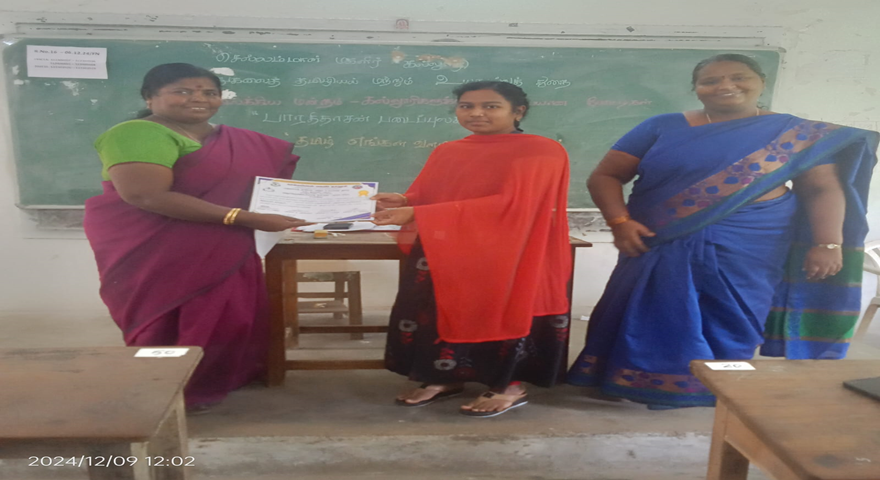 பரிசுப் பெற்ற மாணவர்களுக்கு 11/122024 அன்று நடந்த பாரதியார் பிறந்தநாள் விழா கருத்தரங்கில் கவிப்பேரருவி கலைமாமணி ஈரோடு தமிழன்பன் அவர்களின் கரங்களினால் பரிசுகள் வழங்கப்பட்டது.