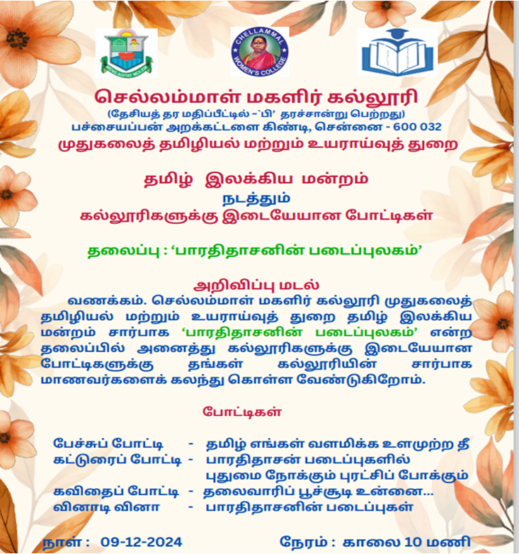 வணக்கம் செல்லம்மாள் மகளிர் கல்லூரி முதுகலை தமிழியல் மற்றும் உயராய்வு துறையின் தமிழ் இலக்கிய மன்றம், முதல்வர் மற்றும் நிர்வாகத்தின் வழிகாட்டுதலின் பேரில் 2024-2025 கல்விஆண்டிற்கான நிகழ்வாக பாரதிதாசனின் படைப்புலகம் என்ற தலைப்பில் பல்வேறு போட்டிகளை, கல்லூரிகளுக்கு இடையே 09/12/2024 அன்று நடத்தியது. சுமார் இருபது கல்லூரிகளிலிருந்து, நூற்றிற்கும் மேற்பட்ட மாணவர்கள் போட்டிகளில் கலந்து கொண்டனர்.