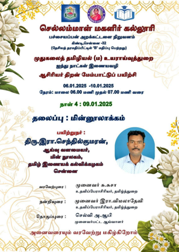்டலத, ்டககியற ம்ிவரககல கிிிிலுுறரில ெ்துத ்ுடககல வுகரிலல ஆெி்ிரரகம நல் மயமதறறல அுடர 06.01.2025 மதல 10.01.2025 வுரரி்்த ஐநு ந்டகம செல்லம்ம மகளிர கல்்ி, முகு் தமிழிரல மற்ல உரர்யவல