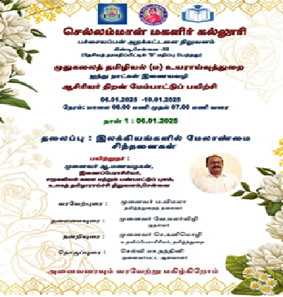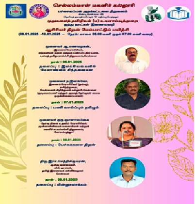 செல்லம்மாள் மகளிர் கல்லூரியின் முதுகலைத் தமிழியல் மற்றும் உயராய்வுத்துறை சார்பாக 09.06.2021 மற்றும் 10.06.2021 ஆகிய இரு நாட்கள் இணைய வழிக் கருத்தரங்கம் சிறப்பாக நடைபெற்றது. முதல் நாள் விழாவில் முனைவர் செல்லத்துரை சுதர்சன், சிரேஷ்ட விரிவுரையாளர், இலங்கைப் பல்கலைக்கழகம், முனைவர் திருமதி.உமாதேவி பேராசிரியர், தில்லி பல்கலைக்கழகம் ஆகியோர் கலந்து கொண்டு சிறப்புரை ஆற்றினார்கள். ஆறு அமர்வுகளில் நடைபெற்ற கருத்தரங்க நிகழ்வில் ஆய்வாளர்கள் தங்கள் கட்டுரைகளை வாசித்தார்கள். நிறைவு விழாவில் முனைவர் பா. இரவிக்குமார் உதவிப்பேராசிரியர் பாண்டிச்சேரி பல்கலைக்கழகம் அவர்கள் பங்கு கொண்டு சிறப்புரை வழங்கினார்கள். முனைவர் சுரேஷ் ரத்தினசாமி சர்வதேசதமிழ் ஆய்விதழ், முதன்மை ஆசிரியர் அவர்கள் ஆய்வுரை வழங்க விழா சிறப்பாக நிறைவுற்றது.