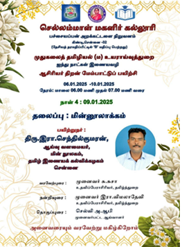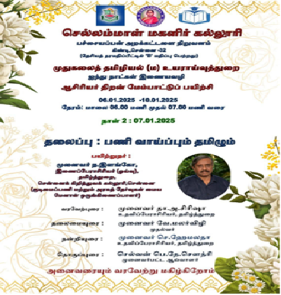 செல்லம்மாள் மகளிர் கல்லூரியின் முதுகலைத் தமிழியல் மற்றும் உயராய்வுத்துறை சார்பாக 07.01.2022 அன்று ஒருநாள் இணைய வழி கருத்தரங்கம் நடைபெற்றது. சிறப்பு விருந்தினராக முனைவர். திரு சக்தி இராவணன் அவர்கள் பங்கேற்று “பழந்தமிழரின் இசைக்கருவிகள்” எனும் தலைப்பில் சிறப்புரை ஆற்றி நிகழ்வினைச் சிறப்பித்தார்கள்.