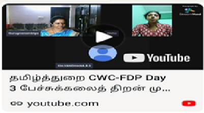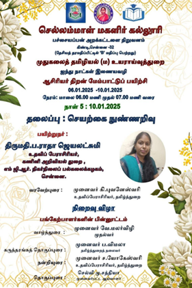 https://www.youtube.com/live/di9IGrrqgDY?si=x_0FIAInWfvoIA7Vஐந்தாவது நாளான 10.01.2025 அன்று செயற்கை நுண்ணறிவு என்னும் பொருண்மையில் எம். ஜி .ஆர் நிகர் நிலை பல்கலைக்கழகத்தின் கணினி அறிவியல் துறையின் உதவி பேராசிரியர் திருமதி பா. ராதா ஜெயலட்சுமி அம்மையார் உரையாற்றினார். இவற்றில் AI என்றால் என்ன அவற்றின் வேலைகள் weak AI, Narrow AI, Strong AI போன்றவற்றின் விரிவாக்கத்தையும், மருத்துவத்துறையில் செயற்கை நுண்ணறிவு செயல்பாடுகளையும் தெளிவாக கூறினார்கள்.