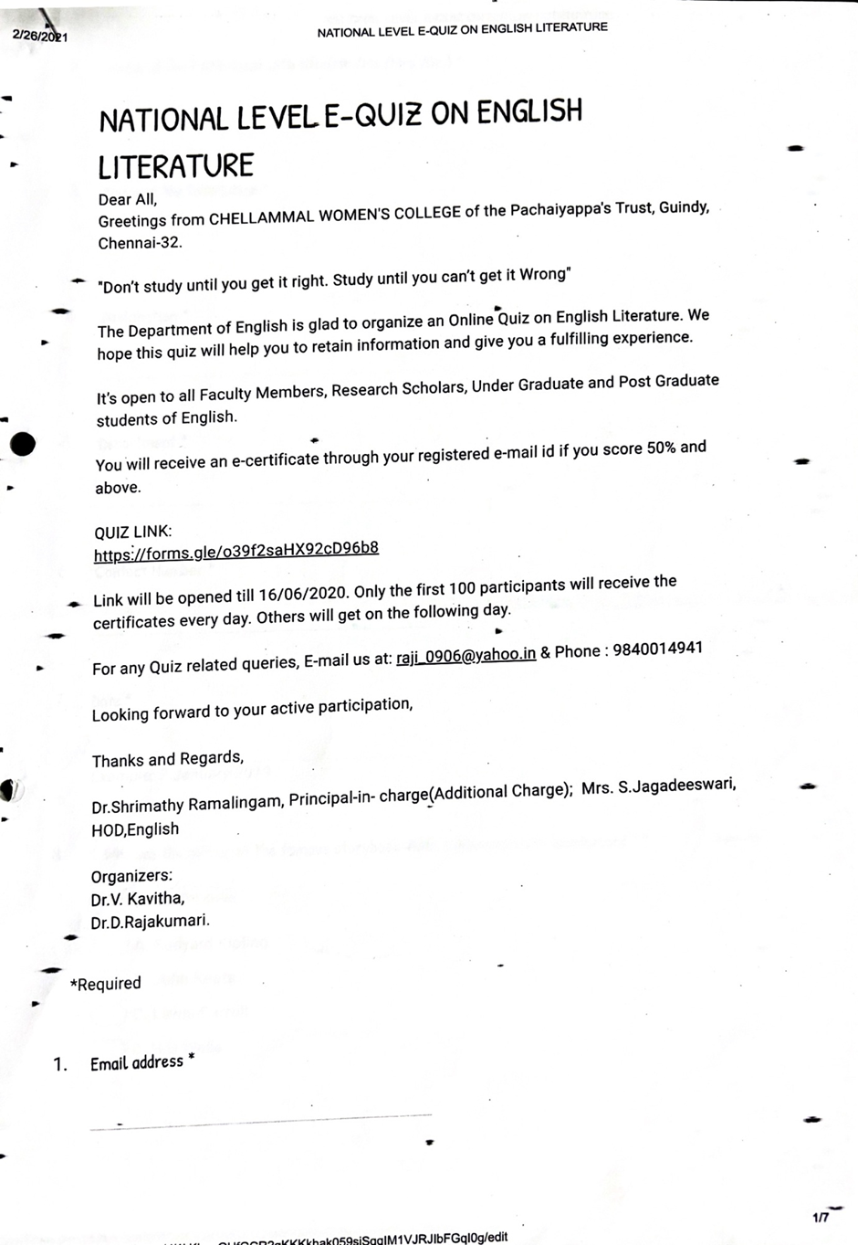 The Department of English at Chellammal Women’s College successfully organized a National Level E-Quiz on English Literature. The quiz, conducted online, garnered tremendous participation and appreciation from across the country.