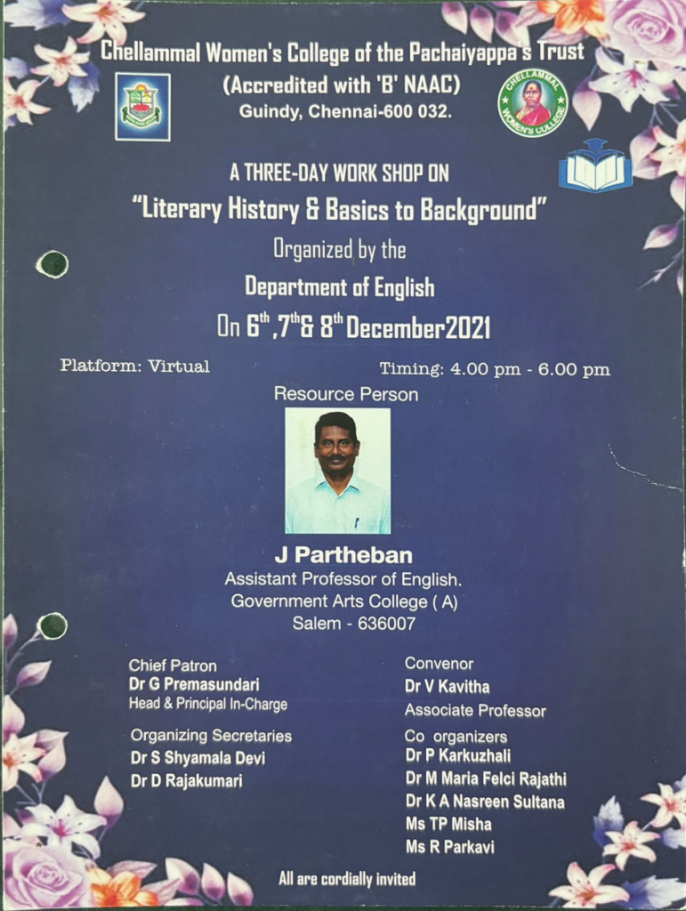 A three-day workshop on “Literary History: Basics to Background” was conducted on December 6th, 7th, and 8th, 2021, via a virtual platform for our II and III-year BA English Literature students.