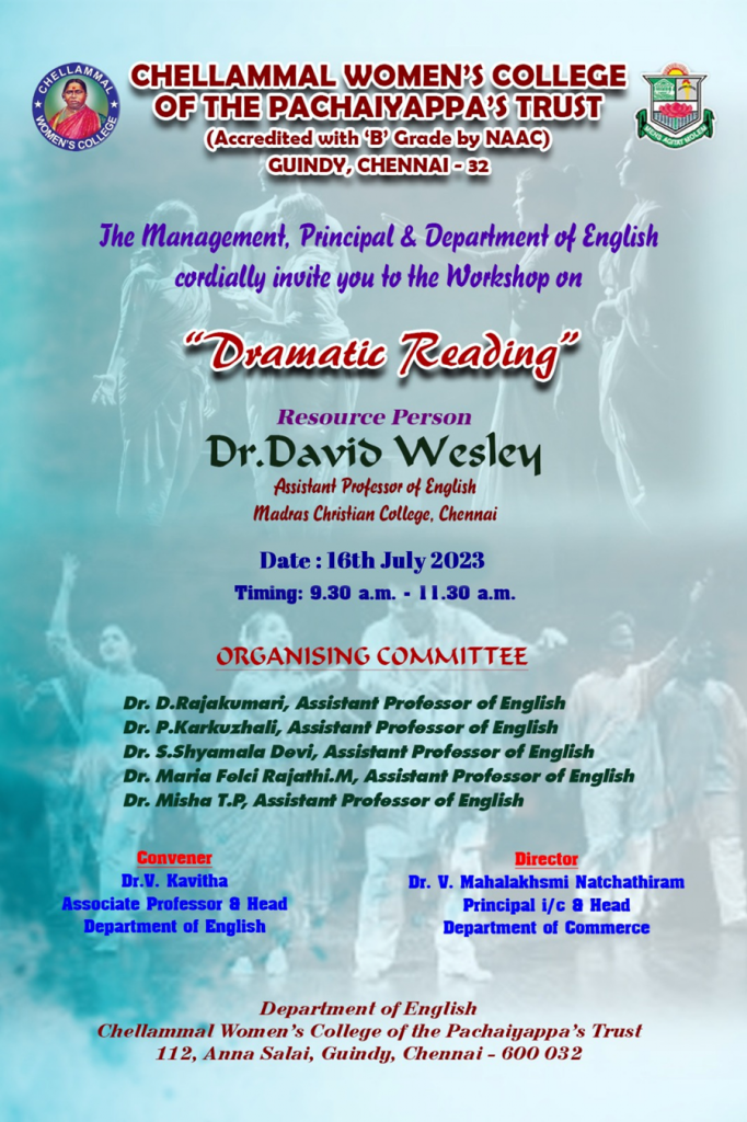 The Department of English at Chellammal Women’s College organized a highly engaging workshop on “Dramatic Reading”in the open-air stage on 16th July 2023. The session was facilitated by Dr. David Wesley, Assistant Professor of English at Madras Christian College, Chennai, who brought his extensive knowledge of theatre and dramatic techniques to the event. The workshop aimed to introduce students to the art of dramatic reading and provide them with practical skills in voice modulation and stage use.
