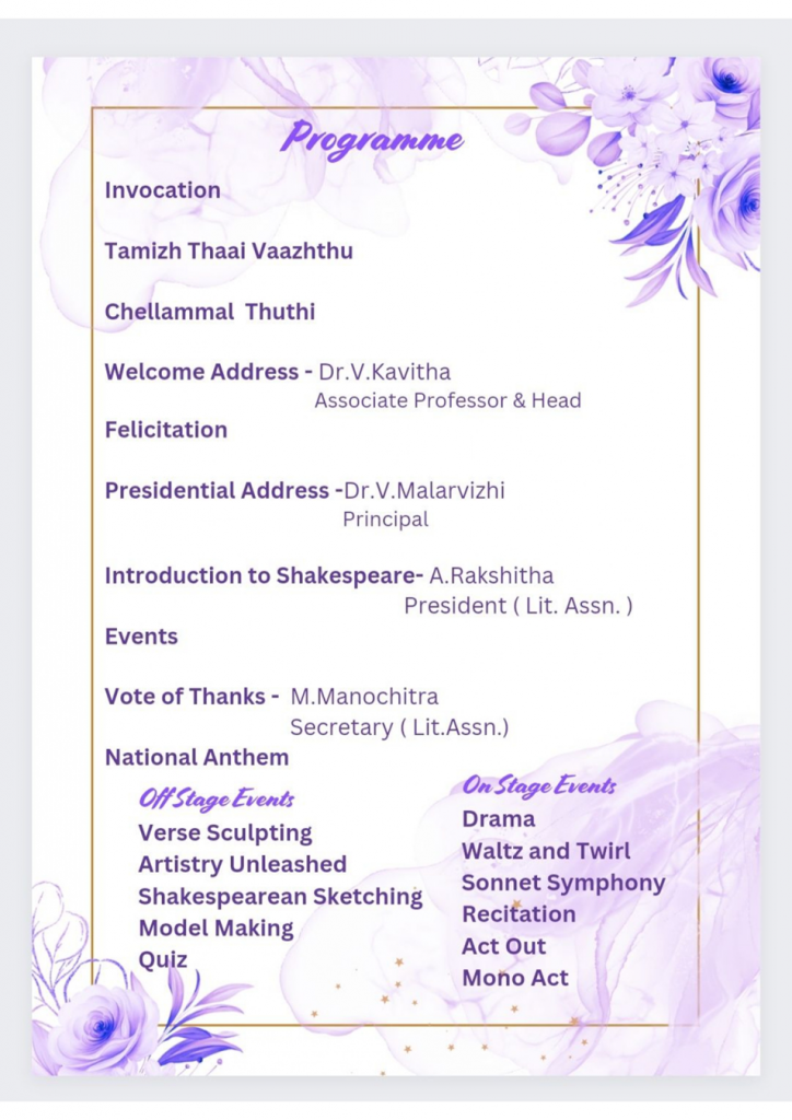Events such as a literary quiz, mono-acting, poetry set to music, enactments of scenes from popular English plays, and other activities were conducted for the students. Prizes and certificates were distributed to the winners by Dr. V. Kalaivani and Dr. S. Sreelatha. The literary fest concluded with a vote of thanks.