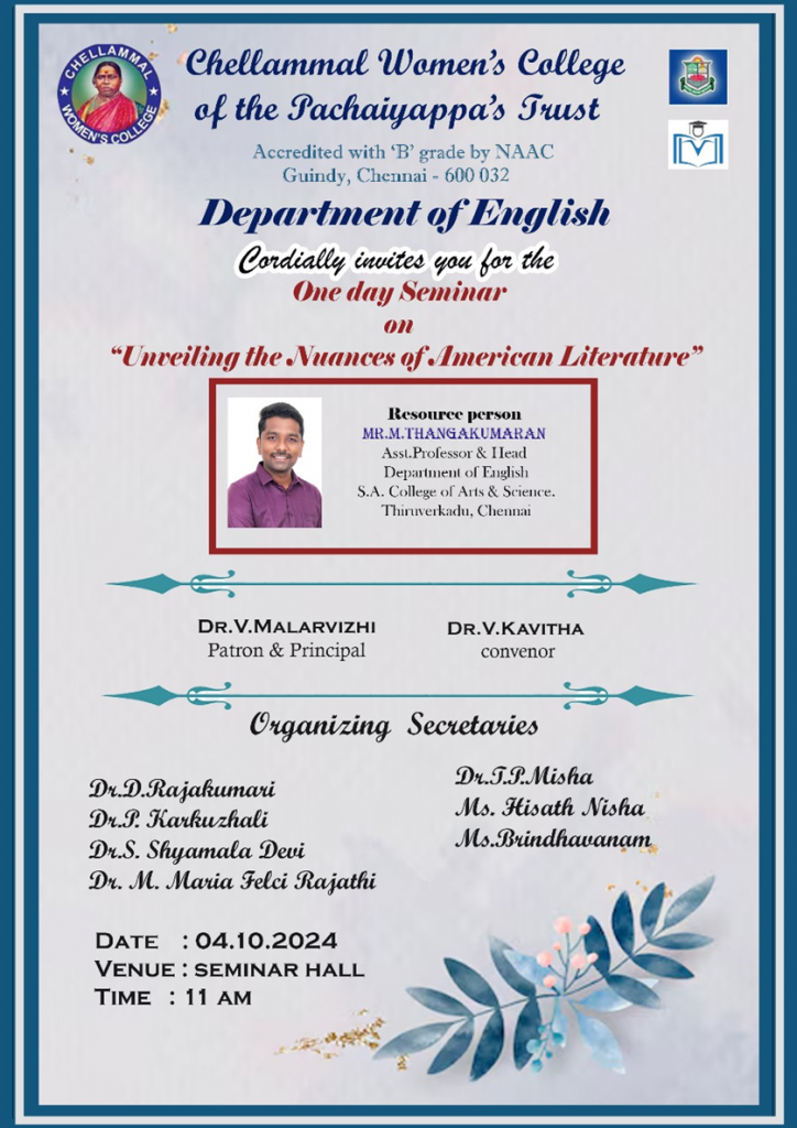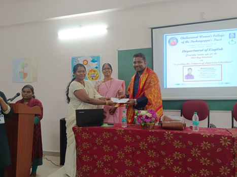 The Department of English at Chellammal Women’s College organized a one-day seminar titled “Unveiling the Nuances of American Literature” on October 4, 2024, in the seminar hall. This event aimed to provide students with an in-depth understanding of American literature, focusing on its historical context, themes, and stylistic features. The seminar’s resource person was Mr. M. Thanga Kumaran, Assistant Professor and Head of the Department of English at S. A. College of Arts & Science, Thiruverkadu, Chennai.