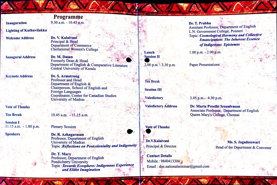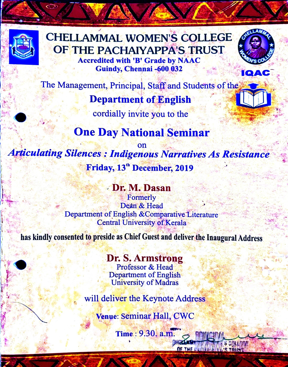 In honor of UNESCO’s declaration of 2019 as the International Year of Indigenous Languages, the Department of English at Chellammal Women’s College, hosted its first national seminar, “Articulating Silences: Indigenous Narratives as Resistance,” on December 13, 2019.