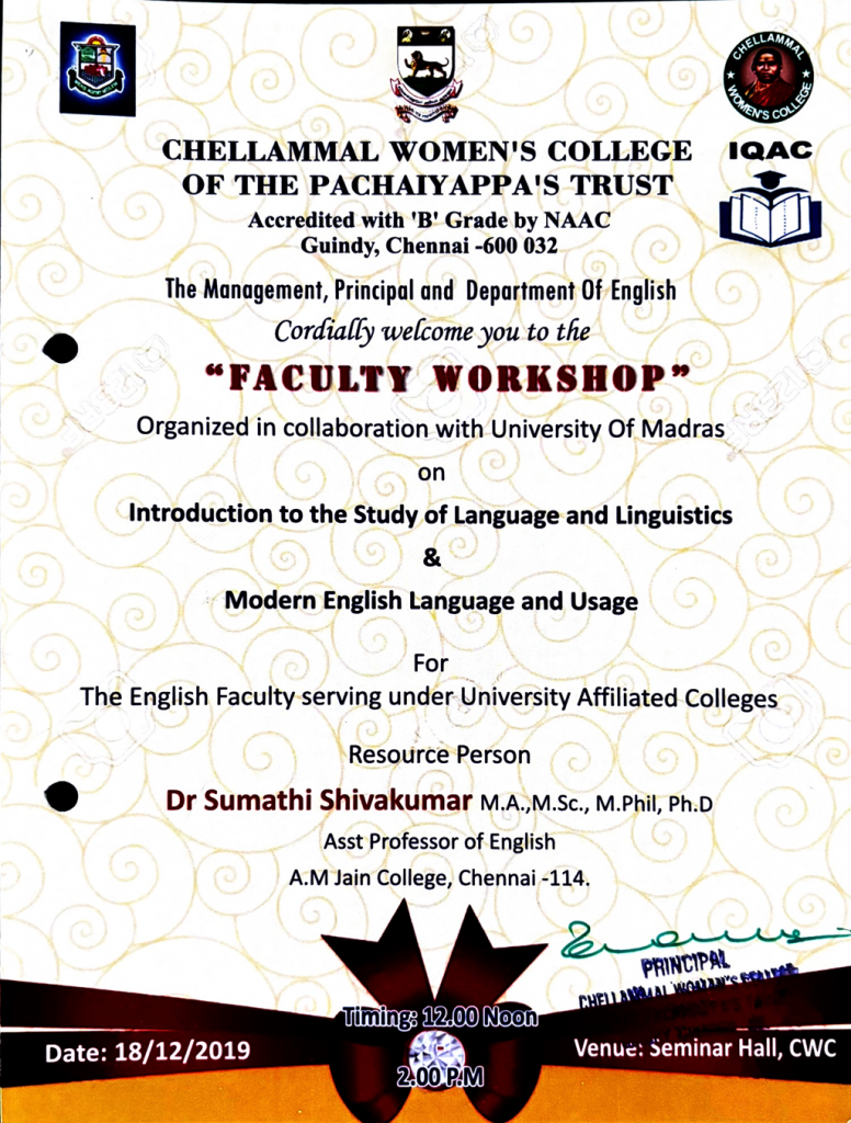 The Department of English conducted a Faculty Workshop on “Introduction to the Study of Language and Linguistics, and Modern English Language and Usage” on December 18, 2019, at the seminar hall. The primary objective of the workshop was to discuss a Learning Outcome-based Curriculum Framework (LOCF), as recommended by the UGC, and was organized in collaboration with the University of Madras. Approximately 30 faculty members from affiliated colleges participated, sharing their views and suggestions on LOCF.