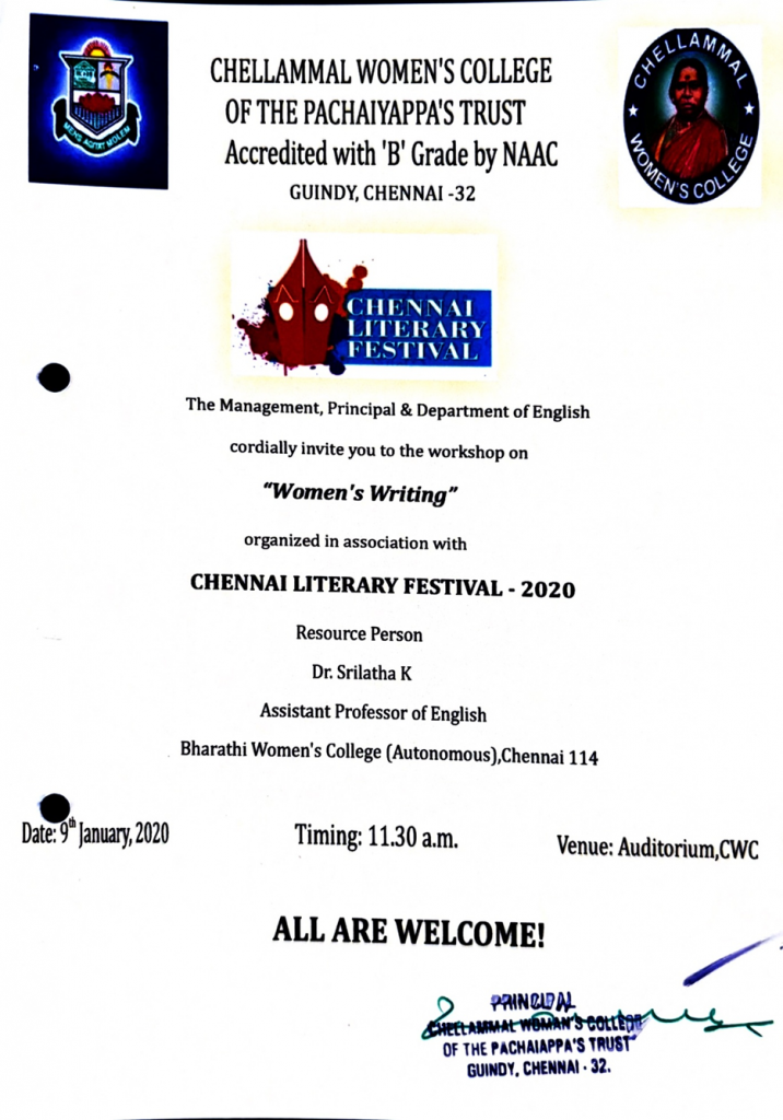The Department of English at Chellammal Women’s College organized a workshop on Women’s Writing on January 9, 2020, at Chellammal Auditorium in collaboration with the Chennai Literary Club and the University of Madras.