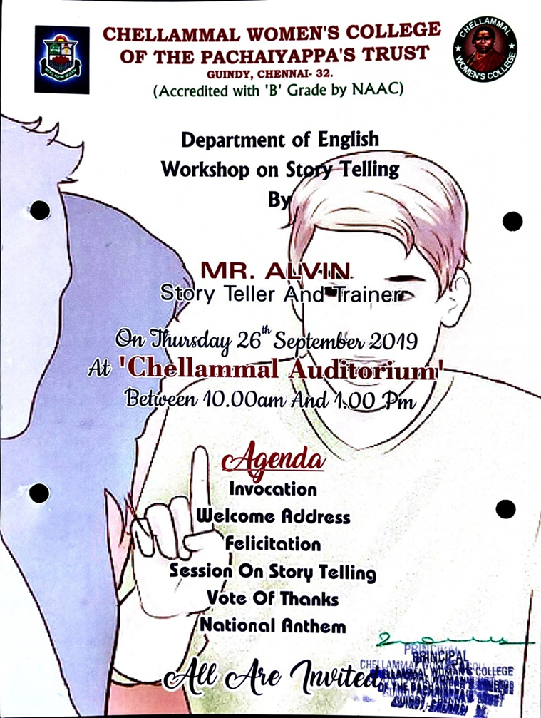 To encourage creative and critical thinking, a workshop on story telling by Mr Alvin,storyteller and trainer, was organized by the Department of English, Chellammal Women’s College on 26th September 2019 at Chellammal auditorium for undergraduate students.
