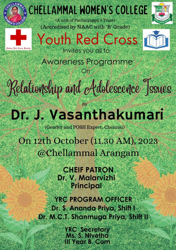 YRC Unit organised Awareness Programme on “Relationship and Adolescence Issues” on 12th October 2023 at Lobbby, Chellammal Arangam.