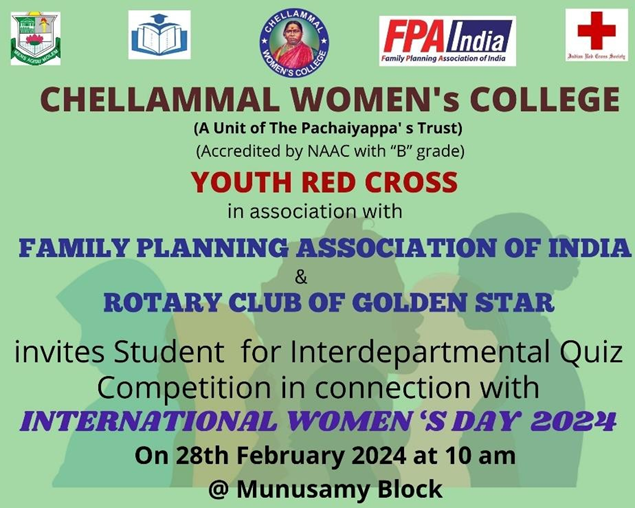 4. The YRC unit of our college in association with Family Planning Association of India (FBI) celebrated “International Women’s Day” on March 8th 2024. The awareness on “Crevical Cancer” and Women wellness by Dr. Priya Pasupathy, Professor of Community Health, MMC, was organized. Pamphlets carrying information about women’s helpline were distributed to students.