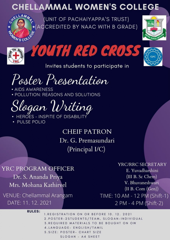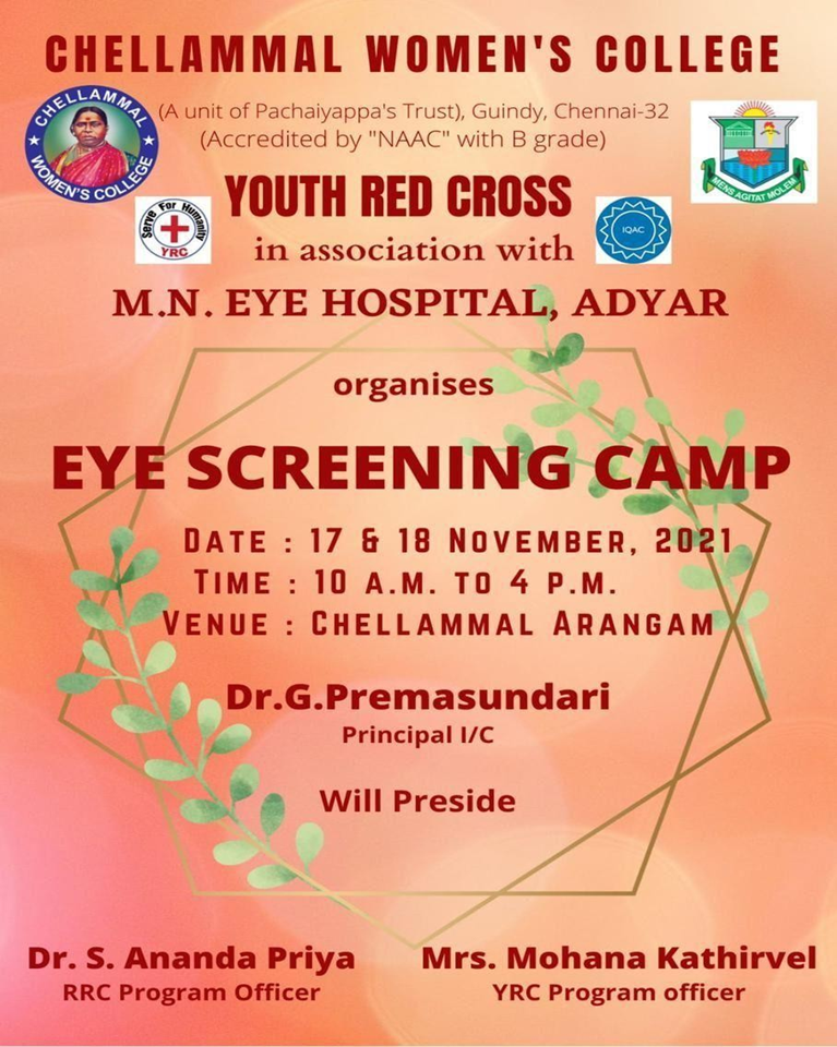 1. The Youth Red Cross(YRC) unit of Chellammal Women’s College in association with Indian Red cross Society (Tamil Nadu Branch) and MN Eye hospital, Adyar, Chennai proposed to organize an “Eye Screening Camp” for two days i.e., on 17th and 18th Nov 2021. In shift-I 158 students and staff members underwent eye screening test and in shift-II 104 students and staff members underwent eye screening test.