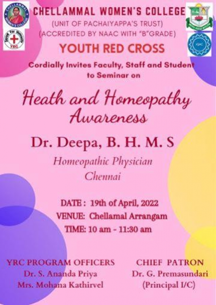 YRC Seminar on “Health and Homeapathy awareness” held on19/04/2022, speaker Dr.Deepa, Homeopathic Physician.