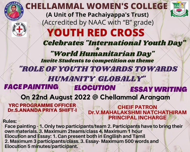 1. On account of International Youth day on 12th August 2022 and World Humanitarian day on 19th August 2022, the YRC unit proposed to create awareness among students on the role of youth to save humanity by conducting inter-departmental competition as such as Face Painting, Essay writing, Elacution on the topic “Role of Youth towards HumanityGlobally”. The competition was held on 24th August 2022 between 10 A.M. and 12 P.M. at Chellammal Aragam, Chellammal Women’s College. The prize distribution ceremony was held on 30.08.2022 at Chellammal Arangam and our Principal I/C Dr.V.Mahalakshmi Natchathiram distributed the prize and certificates to the winners.
