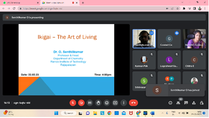 World thinking day, 22.2.23 was celebrated by our Swachhta Action plan committee. A online inter collegiate webinar was conducted along with S.A. College of arts and science on the topic of “IKIGAI- The art of Living, Dr.O.Senthil Kumar, Professor in Chemistry, Ramco institute of technology, Rajapalayam lectured on that topic. Dr.Malathi Selvakumar, DSM- Chennai, MGNCRE, Principal S.A.College of Arts and Science also participated the event. Around 263 were attended the program through youtube and around 40 staff members from S.A College and Chellammal Women’s College were participated through google meet. E certificates were issued to the participants.