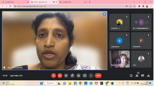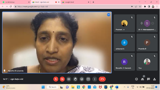 An online webinar was conducted to celebrate “The international Women’s Day” on 7.03.2023 on the topic of “சுக்கா மிளகா சுதந்திரம் கிளியே”