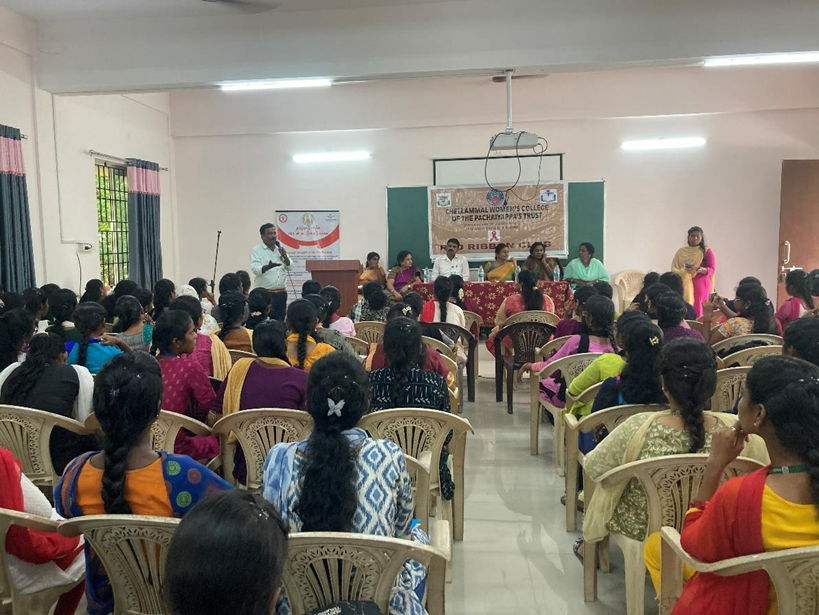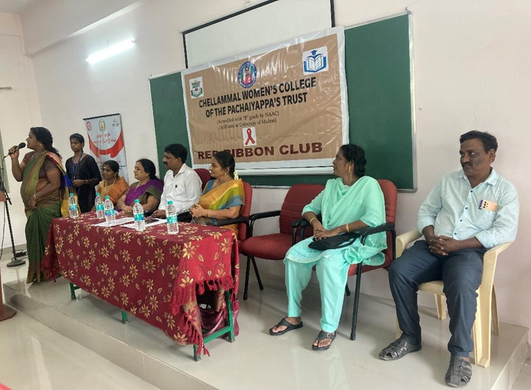 he Red Ribbon Club of chellammal Women’s College organized an awareness programme on HIV/AIDS, Sexually Transmitted Disease and Drug Abuse. Mr.Jeeva, Counsellor, Kilpauk Medical College addressed about drug usage and its various psychological issues, Mrs.B.Umadevi,Counsellor, Saidapet Maternity hospital addressed on four means of transmission of HIV and the various precautionary measures; Mrs.Bharani Vasudevan, District Supervisor, DAPCU created awareness about psychological handling of aids affected patients; Mrs. Beulah, Counsellor,UPHC, Adyar emphasized on social responsibility towards AIDS patient..Mrs.Ashwini, South Chennai PPM Co-ordinator, NTEP, Mr. Prakash, Head Quarters PPM Co-ordinator-NTEP and Mrs. Dharshika, Senior treatment Supervisor, Chennai Corporation addressed the student about various means of transmission of Tuberculosis, their symptoms and TB DOTS.About 80 students from Shift-I and 78 students from Shift-II gathered in Seminar Hall at 9.50 A.M.