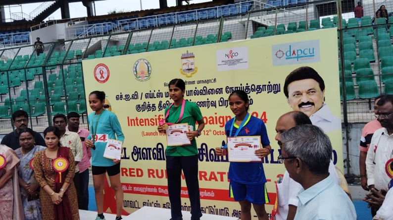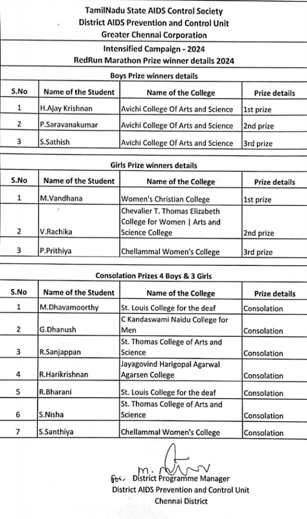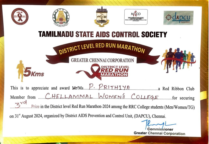 2. Red ribbion club volunteers of our college participated in RED RUN MARATHON organised by Tamilnadu state AIDS control society on 10.09.2024 at Island ground around 6.30 A.M. Our college student Ms. P.Prithiya, II BA Tamil bagged third prize at district level and got selected to state level RED RUN MARATHON held at Tirupur. Ms.S.Santhiya, II BBA secured consolation prize.