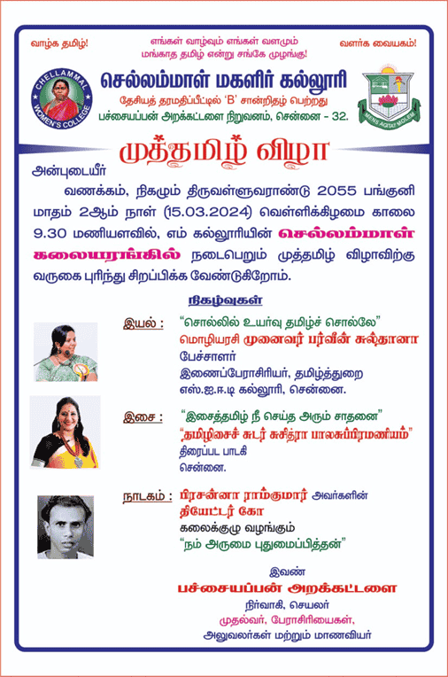 செல்லம்மாள் மகளிர் கல்லூரியின் முத்தமிழ் விழா 15.03.2024 அன்று செல்லம்மாள் கலையரங்கில் நடைபெற்றது. இயற்றமிழுக்கு சிறப்பு விருந்தினராக பேச்சாளர் இணைப்பேராசிரியர் மொழியரசி முனைவர் பர்வீன் சுல்தானா கலந்து கொண்டு “சொல்லில் உயர்வு தமிழ்ச் சொல்லே” எனும் தலைப்பில் உரை நிகழ்த்தினார்.